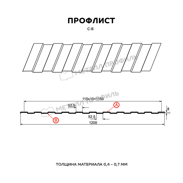 Профиль С-8:Профилированный лист с наиболее маленькой трапецией. Назначение профиля С-8 – по большей части дизайнерская функция, чем прочностная. Такой прокат прекрасно подходит для таких решений, как: внутренняя облицовка индустриальных строений, создание вентилируемых фасадов, системы подвесных потолков, постройка ограждений, не подверженных большим климатическим нагрузкам. Зеркальная форма проката делает С-8 универсальным сырьём для разноплановых архитектурных проектов. Оптимальная толщина металла – от 0,4 до 0,7 мм даёт возможность объектам из профлиста отлично справляться с любым своим назначением. А большая полезная ширина (1150 мм) помогает сэкономить на закупке профлистов. По вашему заказу мы можем изготовить листы металлопроката длиной от 0,5 до 12 метров.